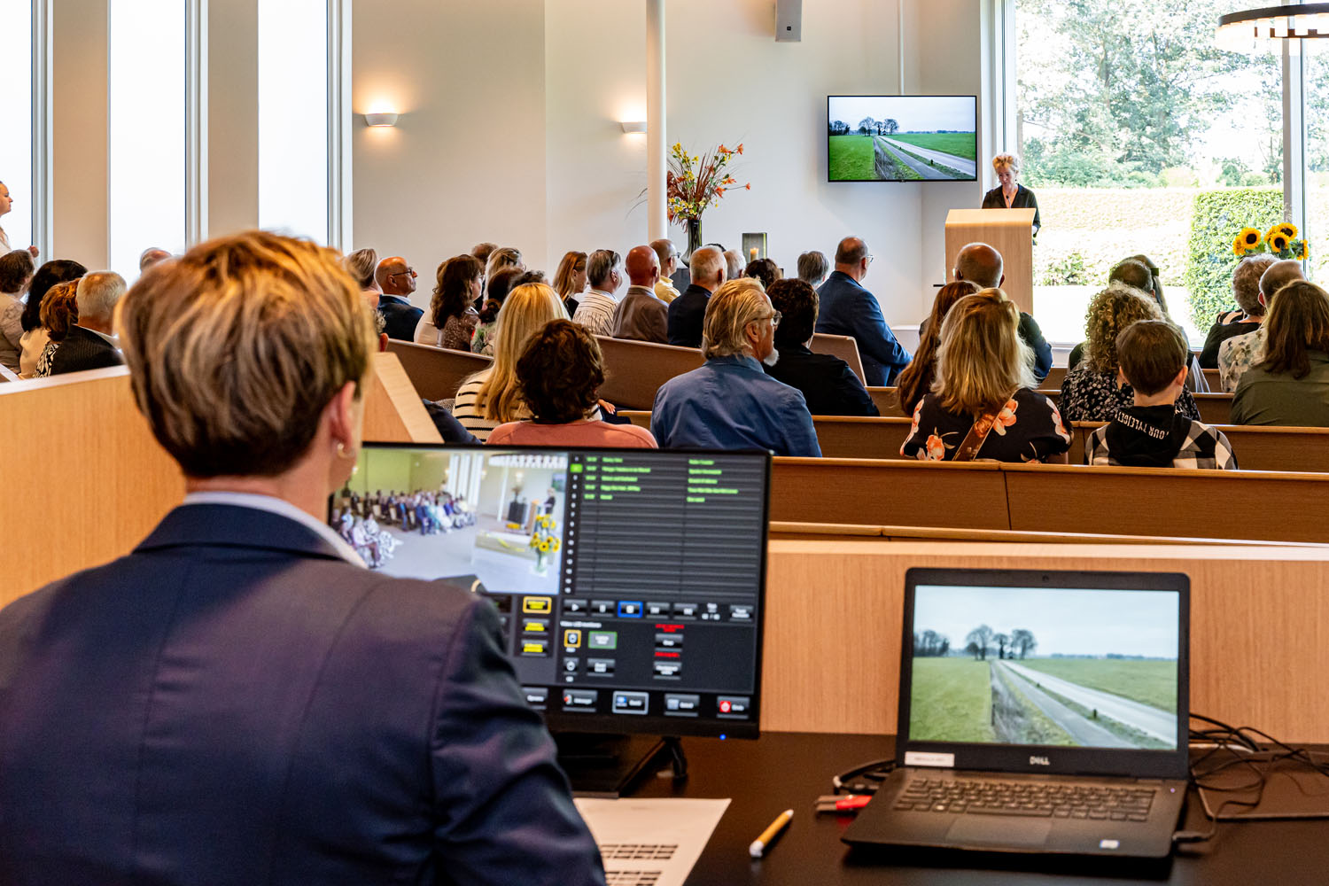 De sfeer van een afscheidsdienst wordt persoonlijk gemaakt door die ene bijzondere foto, of juist dát favoriete nummer. We denken graag met je mee over dit waardevolle onderdeel van het afscheid. Er zijn veel mogelijkheden op onze mooie grote beeldschermen in de aula’s, of zelfs met livemuziek. Onze ruimtes zijn uitgerust met goede beeld- en geluidinstallaties, zodat muziek en video’s op de juiste manier worden weergegeven. In alle aula’s en gastenkamers is een ringleidingsysteem aanwezig, zodat ook slechthorende gasten het afscheid op een prettige manier en storingsvrij kunnen volgen.